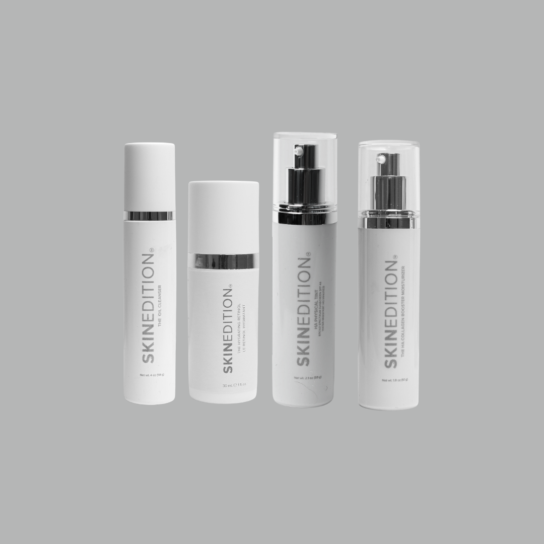 SkinEdition The Oil Cleanser, The Hydrating Retinol, HA Physical Tint SPF, The HA Collagen Booster Moisturizer